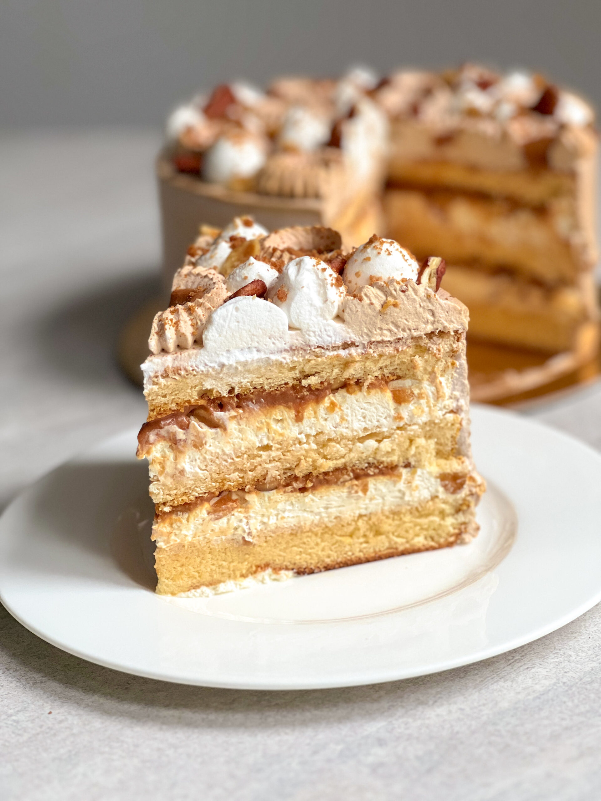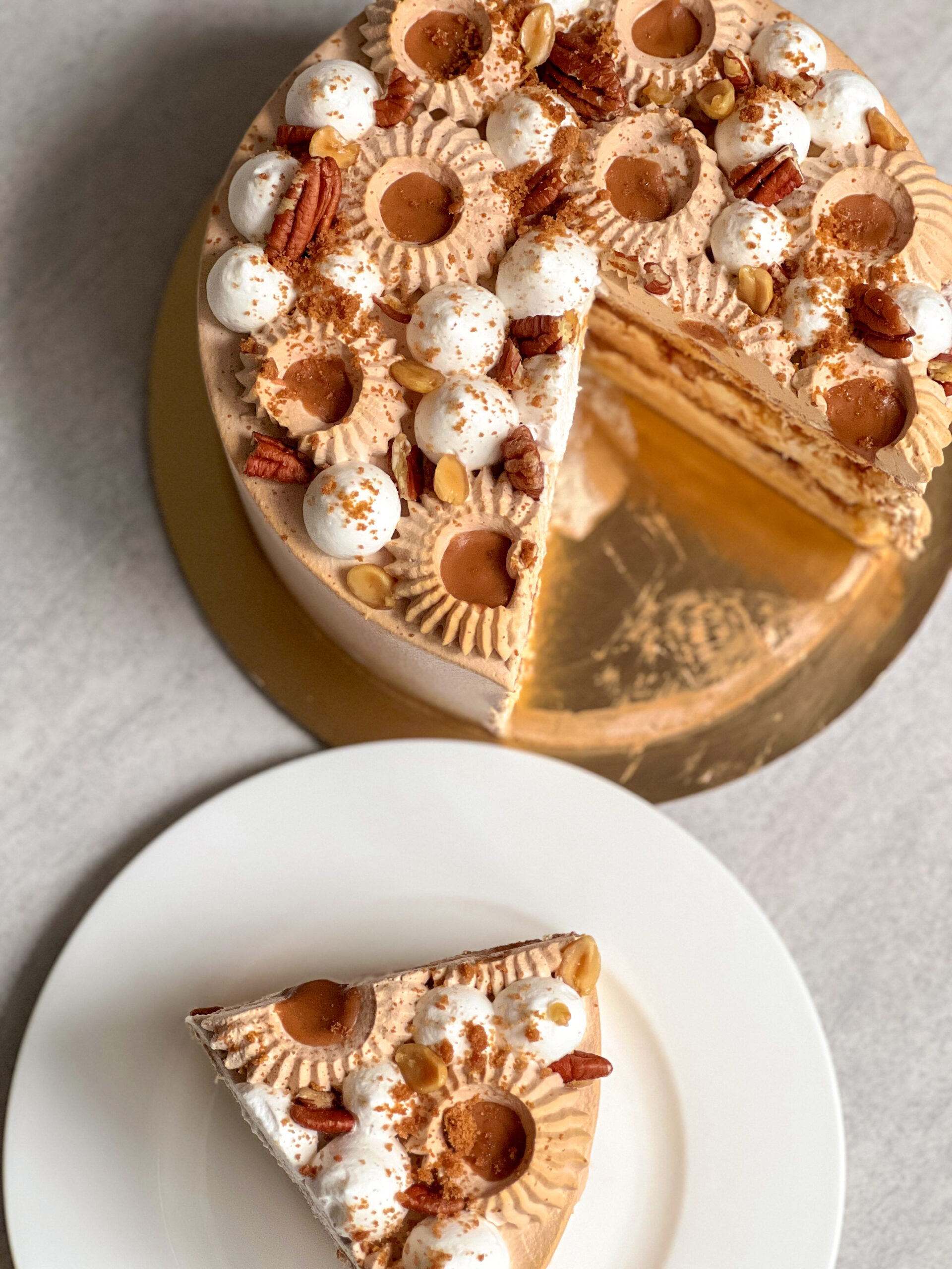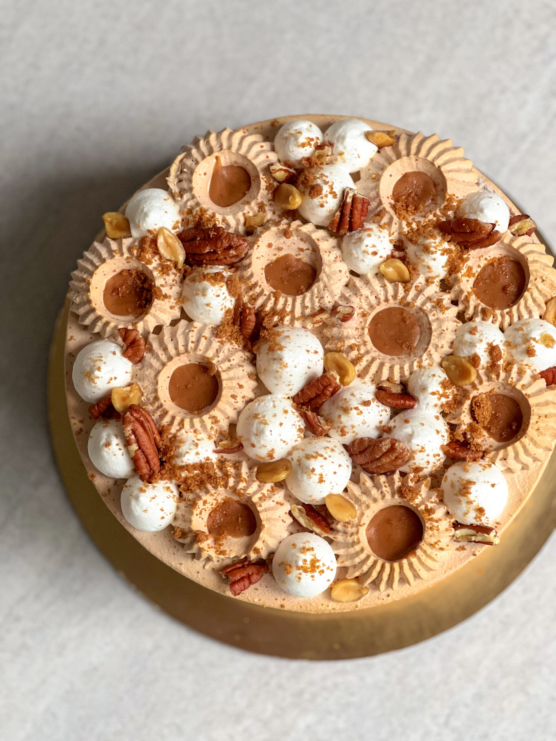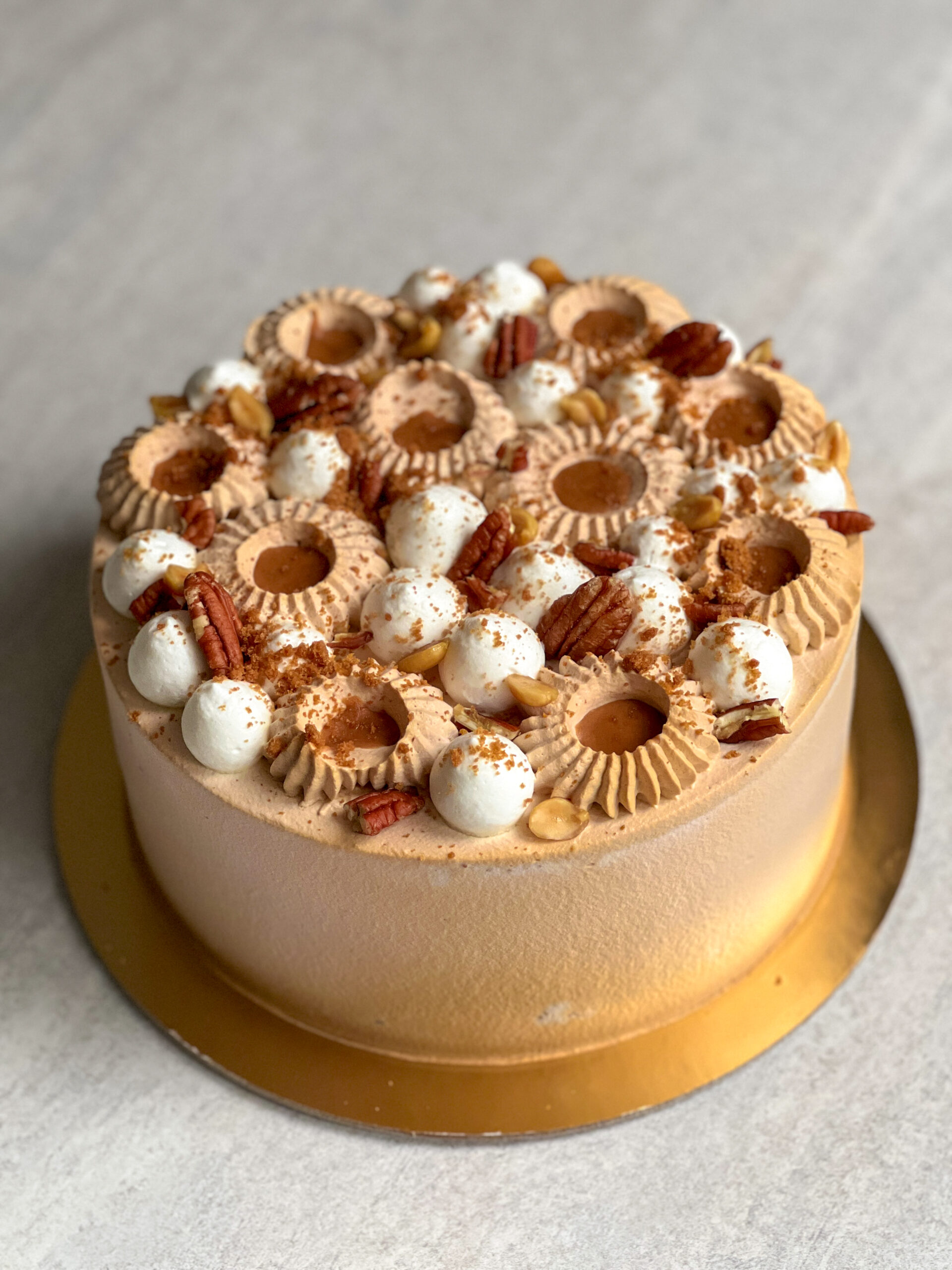 Extra puha vaníliás piskóták, krémsajtos-tejszínes krém, házi sós karamell szósszal, földi mogyoró darabokkal.