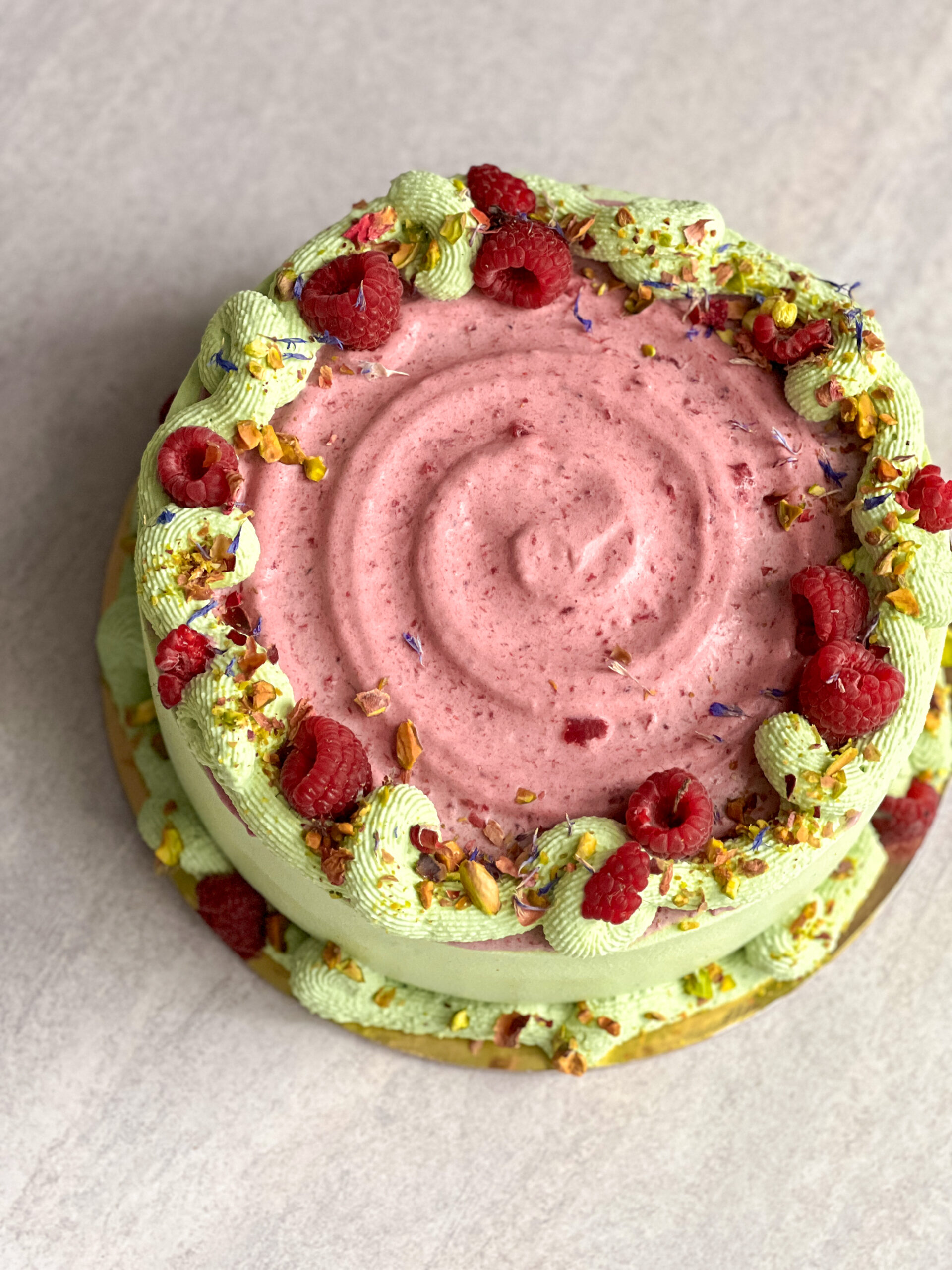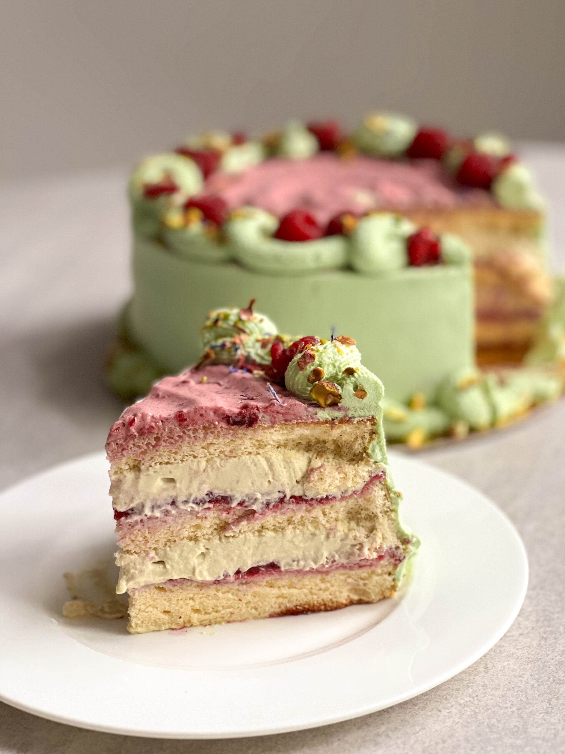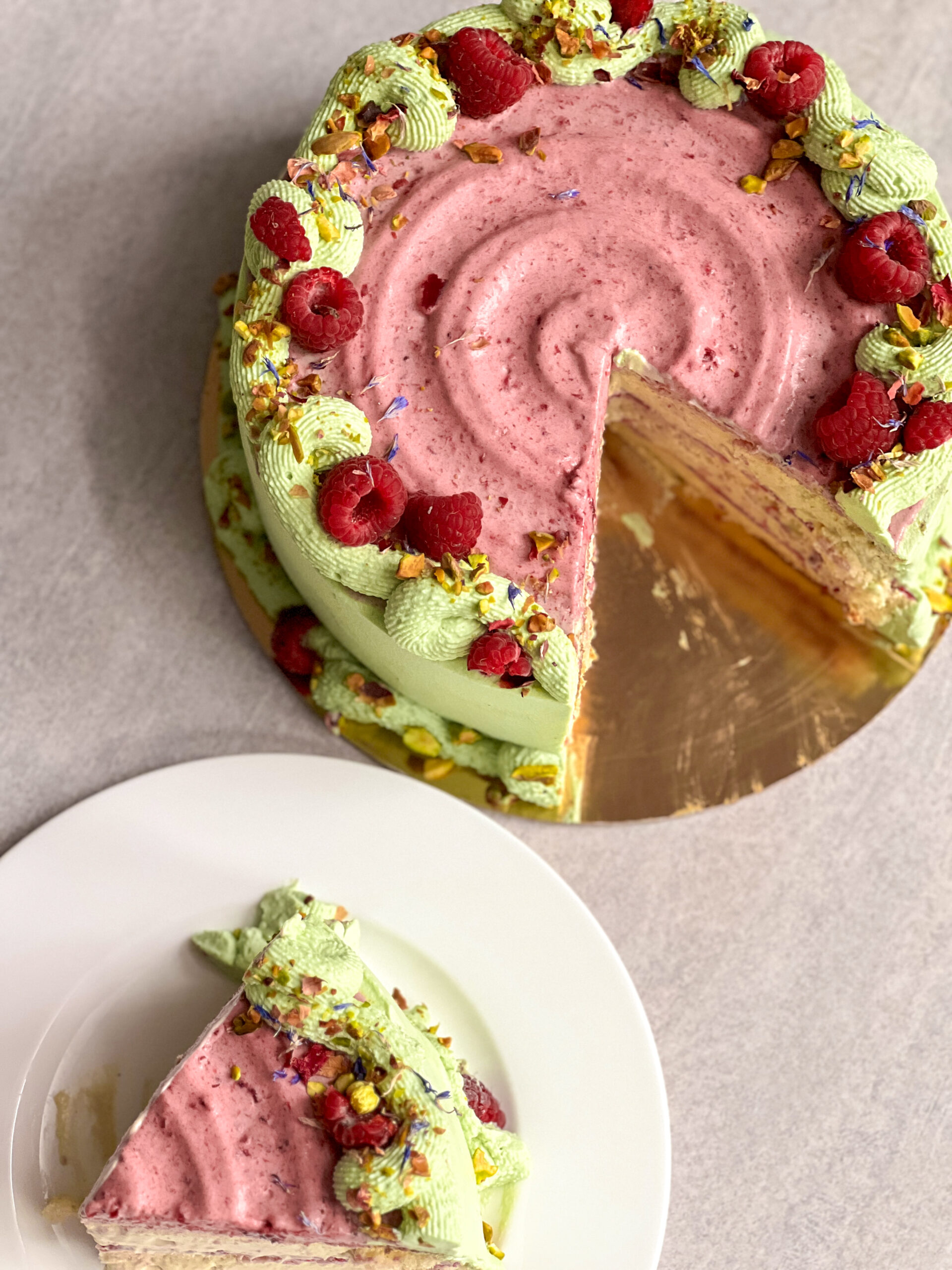 Extra puha vaníliás piskóták, prémium minőségű pisztácia pasztával készített mascarpone alapú krém, málna betéttel minden réteg között.