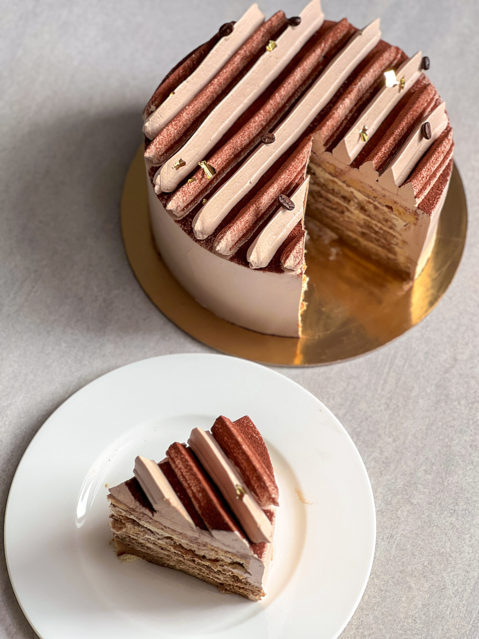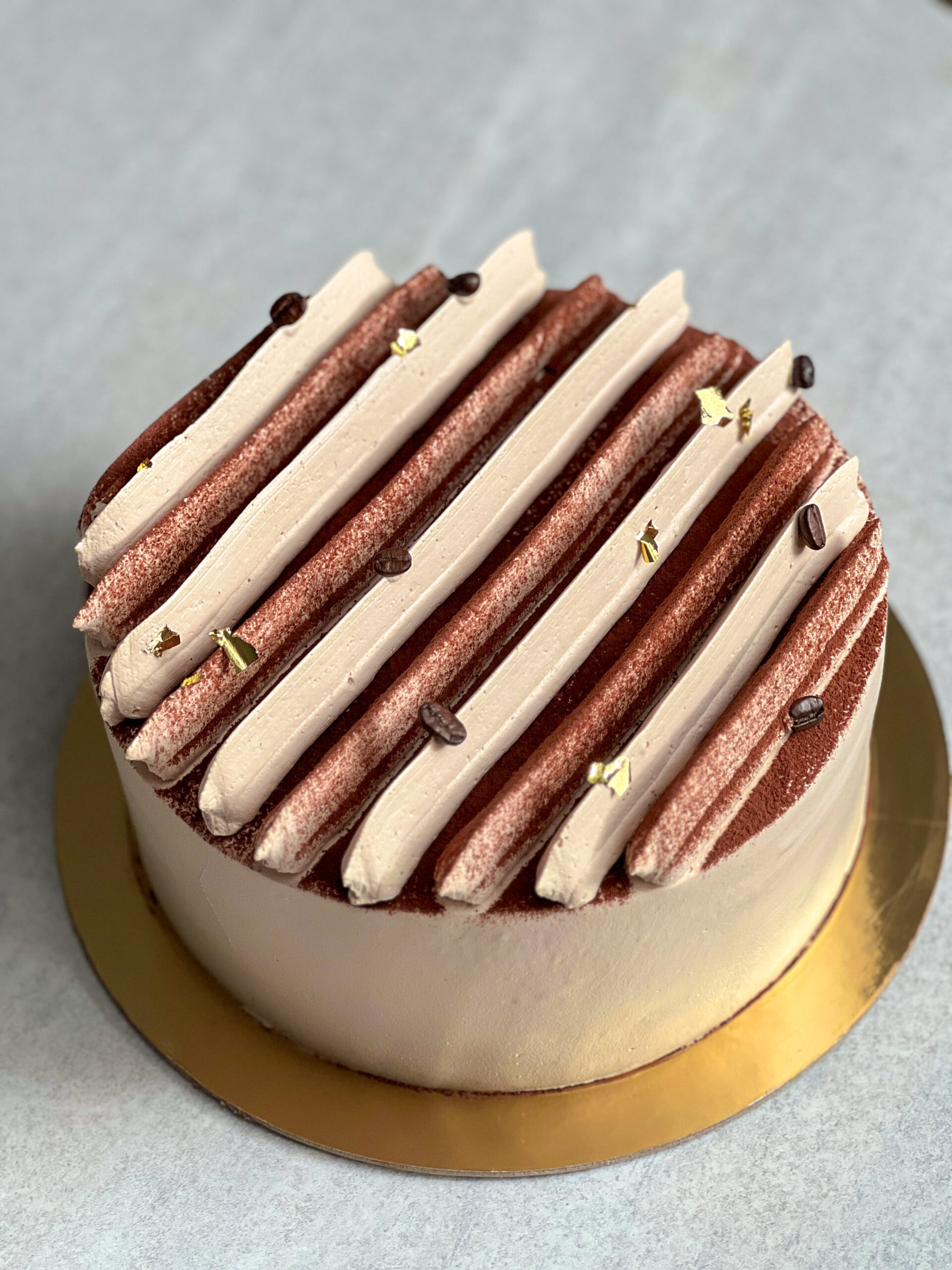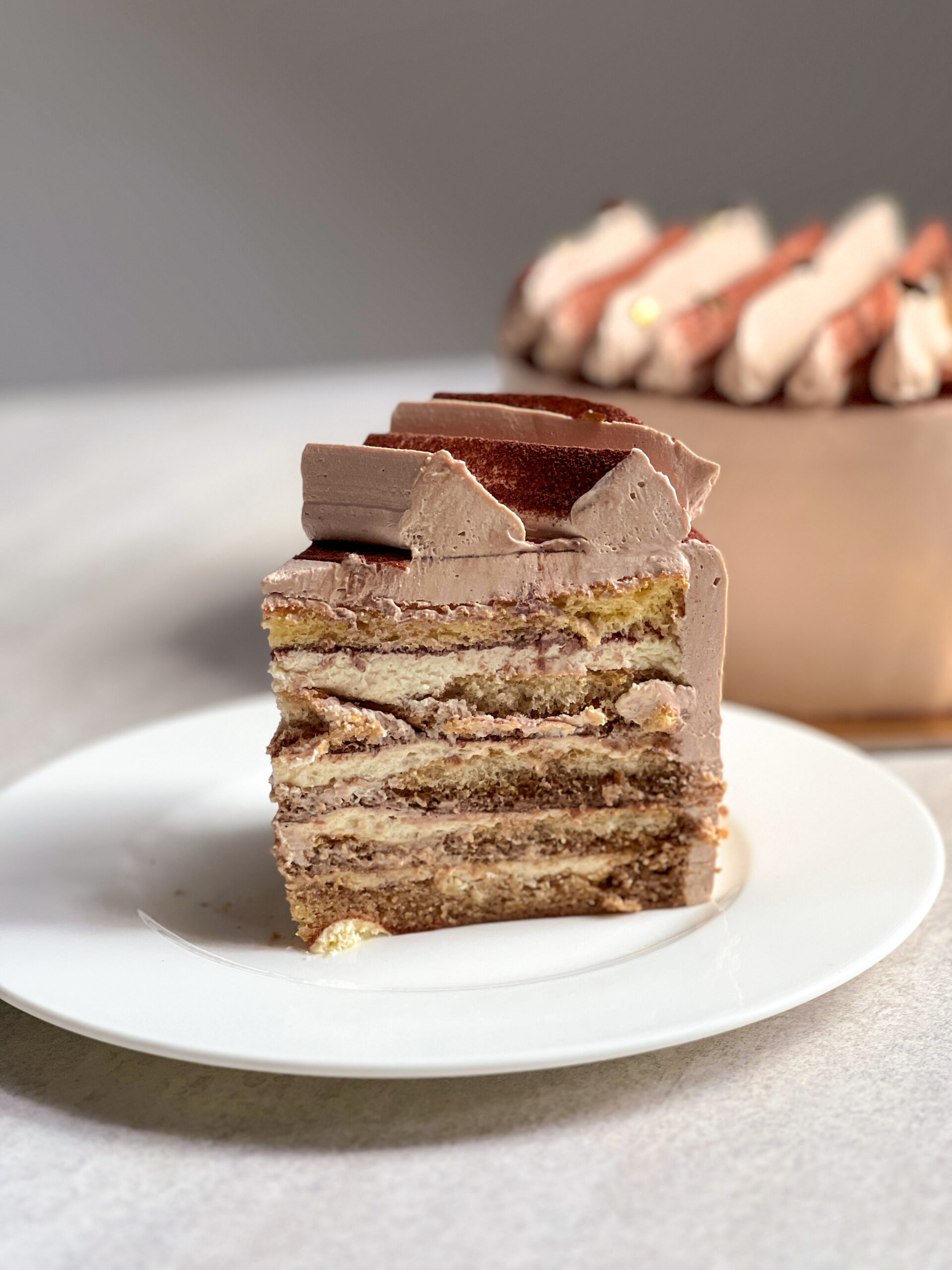 Extra puha vaníliás piskóták, kávéba áztatott babapiskóták, mascarpone alapú krémmel, kakaóval. (nyers tojást nem tartalmaz)